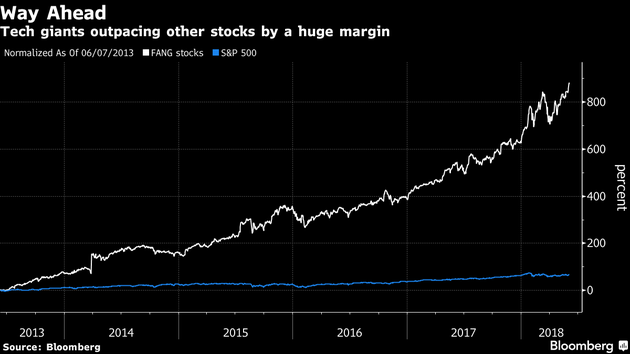 科技股的市值的确很高,Facebook、亚马逊、苹果、微软和谷歌母公司Alphabet的合并市值达到3.8万亿美元,超过德国一年的GDP,甚至超过日本东证指数的整体市值。