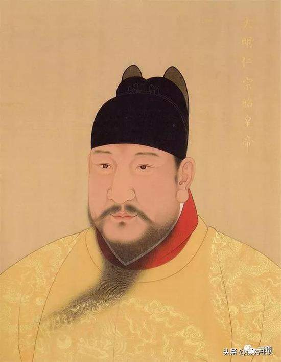 明成祖朱棣和明仁宗朱高炽是朱元璋之子、孙,他们的容貌也被描绘在画像上,姜宝形容南京武英殿成祖像“神武英迈,大异于凡主,长髯孤挺,而生两颊髯空处,真龙髯,真天人之表也”(《凤阿文集》)。胡敬谓南熏殿成祖像“面深赤,虬髯,颏旁别出二绺向上”(《南熏殿图像考》卷上),与姜宝所见别无二致(图19)。仁宗像面庞饱满,髯长及胸,脸型五官甚肖乃父(图20),丝毫看不出二者同“异像”之人物有任何遗传关系。所以“异像”只是对朱元璋的一种神化,强调他“真龙天子”的身份,跟真实相貌是完全没有关系的。