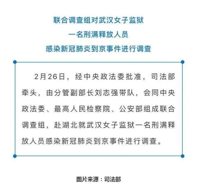 目前确认,该女子来自武汉女子监狱。26日,经中央政法委批准,司法部牵头,会同中央政法委、最高人民检察院、公安部组成联合调查组,赴湖北就该事件进行调查。湖北省也已成立由省纪委监委牵头,省委政法委、省检察院、省公安厅、省司法厅组成的联合调查组,立即开展调查工作。湖北省委书记应勇要求“迅速查清事实,依纪依法严肃处理,及时回应社会关切。此事还是否涉及其他违法违纪问题,也要彻查。不论涉及到谁,都要一查到底。”尽管调查结果还未出来,但及时回应舆论关切、迅速展开调查等行动,值得肯定。期待尽快公布调查结果,消弭猜测谣言,才能让大家安心,也有利于疫情防控查找盲区、堵住漏洞。
