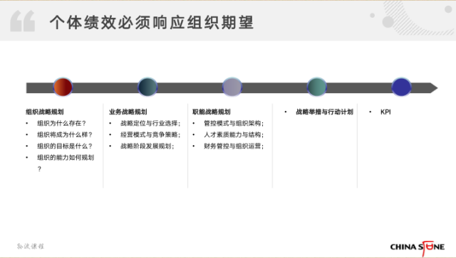 绩效管理是战略落地的工具,这个角度去看个体绩效,那么个体绩效必须响应组织的期望。首先,组织有自身的使命、愿景等顶层事业理论和战略规划。然后把顶层的战略规划转换成业务、产品经营模式,这叫做业务战略规划。下一步,在具体的职能层面,管控模式、组织架构、人力资源管理、财务管控、生产运营如何支撑业务就构成了职能战略。再往下,规划每一部分职能当期的举措或者行动计划,而再根据计划指标进行评价、考核。从这个逻辑链可以看到,个体绩效来源于组织战略的成功地分解。所以,绩效管理的过程其实就是战略执行的过程。绩效管理也是分阶段的。很多企业存在战略不清晰的问题,这种情况下的绩效管理,更多的是从职能出发。这种对岗位履职情况的考核,虽然也叫做绩效管理,但是显然不能称之为战略性的绩效管理。