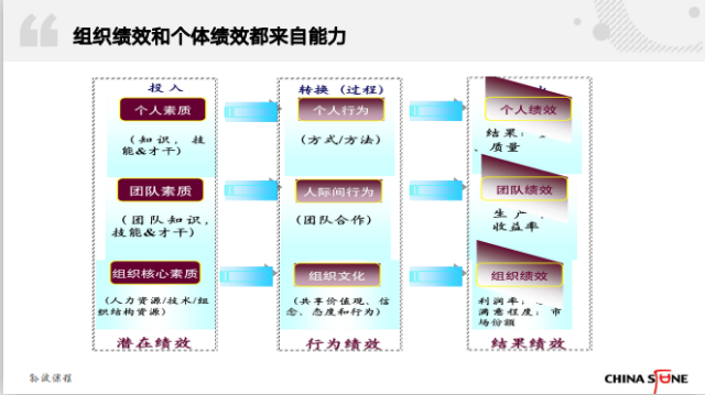 无论组织绩效和个体绩效,其实都是来自于能力。无论个体绩效、还是团队绩效、还是组织绩效,都来自于投入转换的过程。但是具体构成有差异,比如个体绩效来自于个人的知识、技能、才干等等,个人素质作为投入,通过个人的被激励的状态、个人做事的方式和方法,带来个体的绩效和产出。而团队的投入来自于团队中个体所形成的有机的最优结构。在最优结构之下,团队内部不同的角色行为方式的合理性,产生团队的绩效。组织绩效‍来自于组织的投入,包括组织的硬件、软件、人员、管理、氛围,甚至企业家精神、历史、文化、氛围等等,我们称之为组织的核心素质。组织的核心素质,通过一体化的行为方式,或者组织文化之下大家共享的价值观所带来的行为模式,带来组织的绩效。
