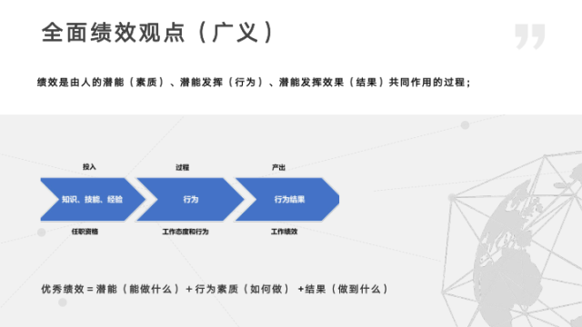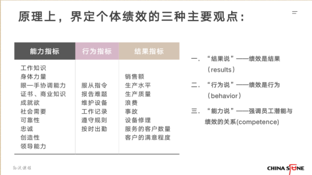 关于个体绩效的概念,有三个变量构成了个体绩效的演进:投入、过程、产出,分别代表着个体绩效的潜能论、行为论和结果论。结果论、行为论、潜能论之争,核心在于绩效究竟是看结果,还是看过程。基于不同的侧重,结果、行为和能力就有了不同的评价指标。如果不清楚为什么这样评价的话,这些指标的取舍会非常困难。因为无论哪一个指标看起来都应该被重点关注,任一个指标都有可能属于我们所理解的绩效概念的范畴。但其实三种观点是有巨大差异的。