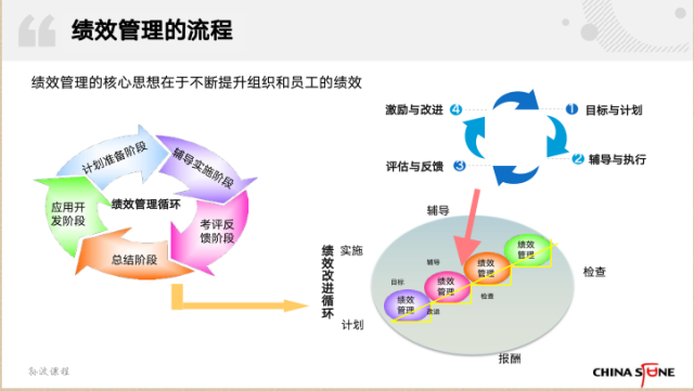第二个循环,从个体角度表现出一个绩效改进的循环:先确定目标,通过目标达成共识,然后辅导员工去完成这个目标,在辅导基础上检查目标的完成情况,进行持续的改进,构成下一阶段目标,再进入下一个绩效管理循环。这里包括了目标与计划、辅导与执行、评价与反馈四个阶段。