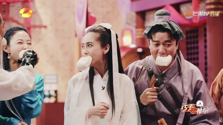 到了甄别环节“巧手夫妇”即使被点了哑穴,嘴里塞上了馒头,但却依旧阻挡不住两人之间的眉目传情。即使中间隔了Angelababy杨颖扮演的小龙女,即使出现了一些意见上的分歧,二人在眼神交流加上嘴里被塞住馒头的哼哼中竟也慢慢有了些许撒娇的味道,到后来还开始互相嘲笑对方的造型,空气中都仿佛弥漫了撒狗粮的味道,简直虐惨了他们的儿子“郭破虏”。