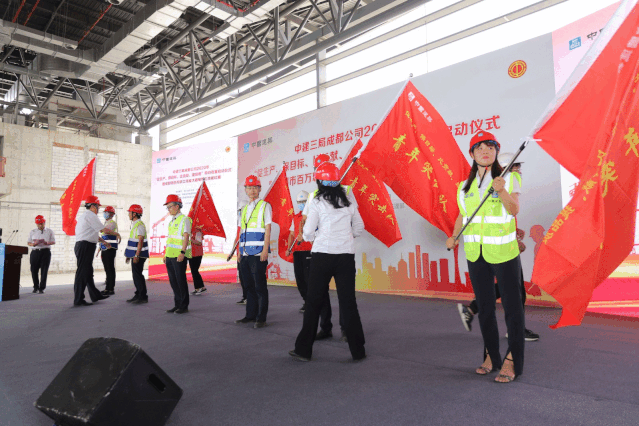 四川省总工会经济技术部部长李龙昊为五个党员先锋队授旗。成都市交建工会常务副主席王灏为五个工人先锋号授旗。中建三局工会副主席、工会工作部部长杨柳,中建三局西南分局党工委副书记、纪工委书记、工会主席陈苏东为六个青年突击队授旗。