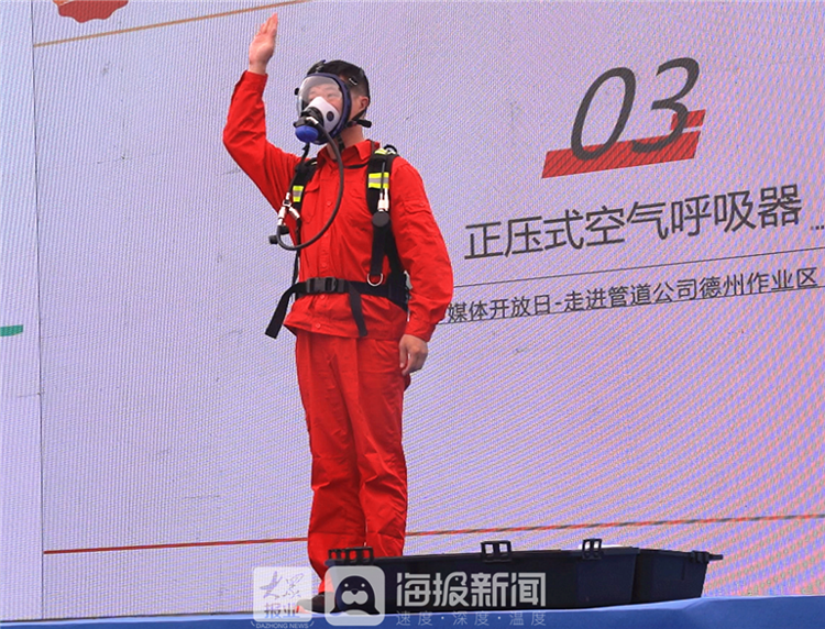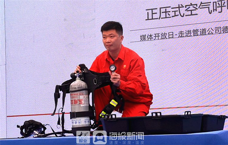 中国石油管道公司中原输油气分公司综合运维亓振正在展示正压式空气呼吸器