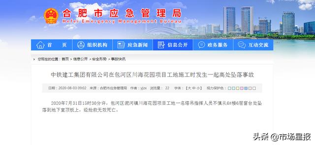8月3日,据合肥市应急管理局网站消息,2020年7月31日15时30分许,中铁建工集团有限公司在包河区淝河镇川海花园项目工地一名塔吊指挥人员不慎从6#楼6层窗台处坠落到地下室顶板上,经抢救无效死亡。