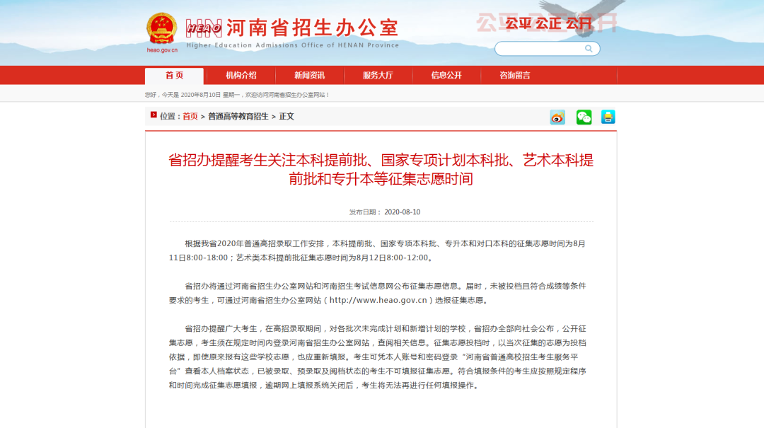 提醒!河南省第一次征集志愿网上填报时间为8月11日
