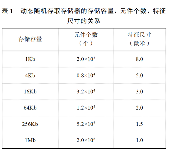 为了便于从宏观上考察微电子技术及相应生产线的工艺水平,一般以典型产品动态随机存取存储器(Dynamic Random Access Memory,DRAM)的容量为指标。动态随机存取存储器主要的作用原理是利用电容内存储电荷的多少来代表一个二进制比特(bit,也称作“位”)是1还是0。动态存储器的结构十分简单,每一个数据存储单元都只需一个电容和一个晶体管来处理。所以,1K容量的动态存储器,需要集成2048个元件。