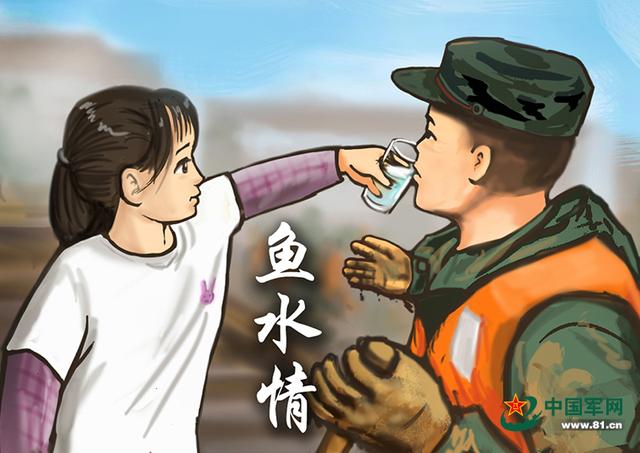 小女孩踮脚给满手泥的兵哥哥喂水