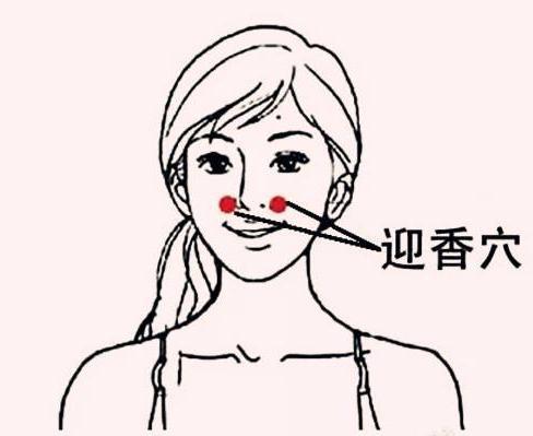 按摩前全身放松、舌尖抵上腭,将双手中指指尖点于迎香穴,待有酸胀感后,再两手中指或食指指肚顺逆各揉搓20~30次,以迎香穴发酸、发胀、发热为度。