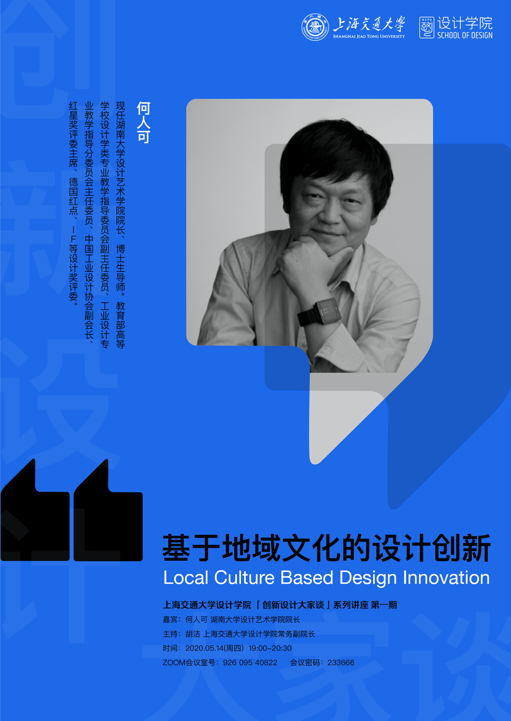 为在“抗疫”期间“停课不停学”,宣传创新设计理念,上海交通大学设计学院开展《创新设计“大家”谈》线上学术论坛。5月14日晚7点,上海交大设计学院设计系特邀湖南大学设计艺术学院院长何人可教授,在zoom会议室开启《创新设计“大家”谈》线上学术讲座第二场。本次讲座由设计学院常务副院长胡洁教授主持,湖南大学何人可教授主讲。讲座题目为“基于地域文化的设计创新”。