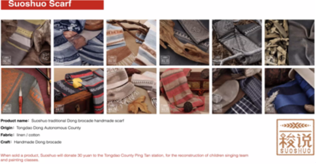 在这个过程当中他们创造了一个非常独特的少数民族的互联网品牌"梭说",相继设计了围巾,包包等。他们希望通过这样一个品牌打开一个通路,将中国的传统文化传到全世界。目前这些产品通过互联网,通过相关的一些企业,比如美克美家的旗舰店、淘宝、微商等把它传播到中国各地和世界各地的市场。