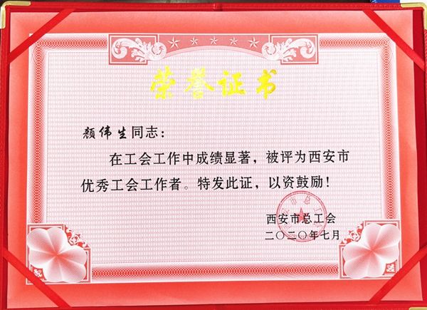 西安市第五医院工会主席、副院长颜伟生同志荣获“西安市优秀工会工作者”荣誉称号