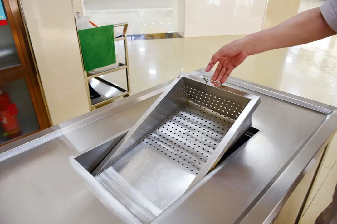 鞍钢人才公寓餐厅每餐的剩饭、剩菜、汤汁混在一起,倒进垃圾袋中,极易将垃圾袋刺破,漏在地上造成污染。另外,做刀削面的机器,两侧的挡板低,工作中手容易触碰到刀片,面也经常削到地面上,既不安全,也浪费食材,还影响地面卫生。