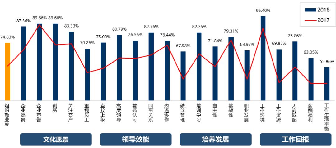 通过第二年的调查追踪发现,公司整体敬业度提升超过10%。而第1年被调查鉴别出急需干预的部门,其负责人在相关方面的践行,带来部门敬业度获得超过20%的跃升。