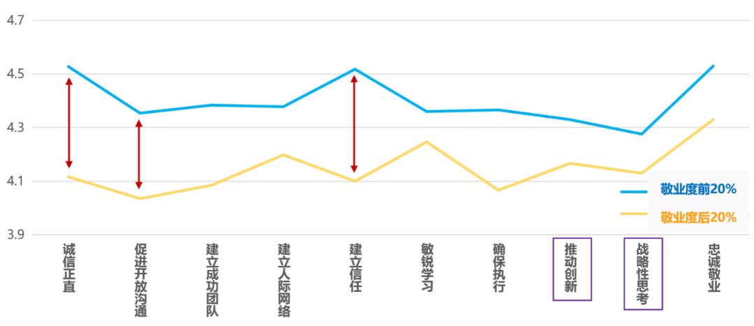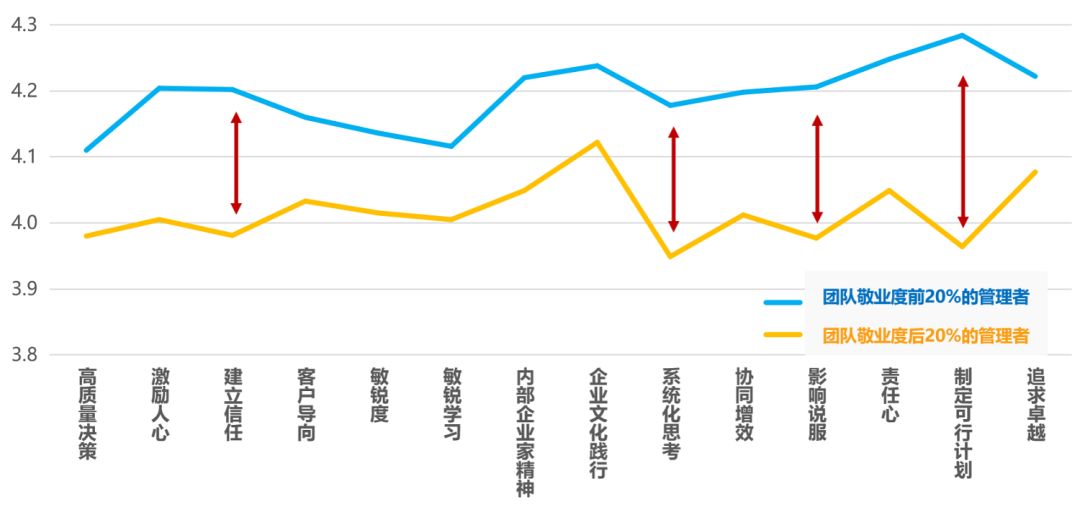 如下图,我们在评估结束后,通过团队敬业度排名找到对应的管理者,排名前20%的与后20%的管理者在领导力上的差异,能够反映出当下员工对管理者的诉求