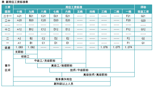 新的岗位等级标准表分别包括岗位工资和浮动效益工资两部分。岗位工资共分21级,每级分10档。新工资结构具备以下特点: