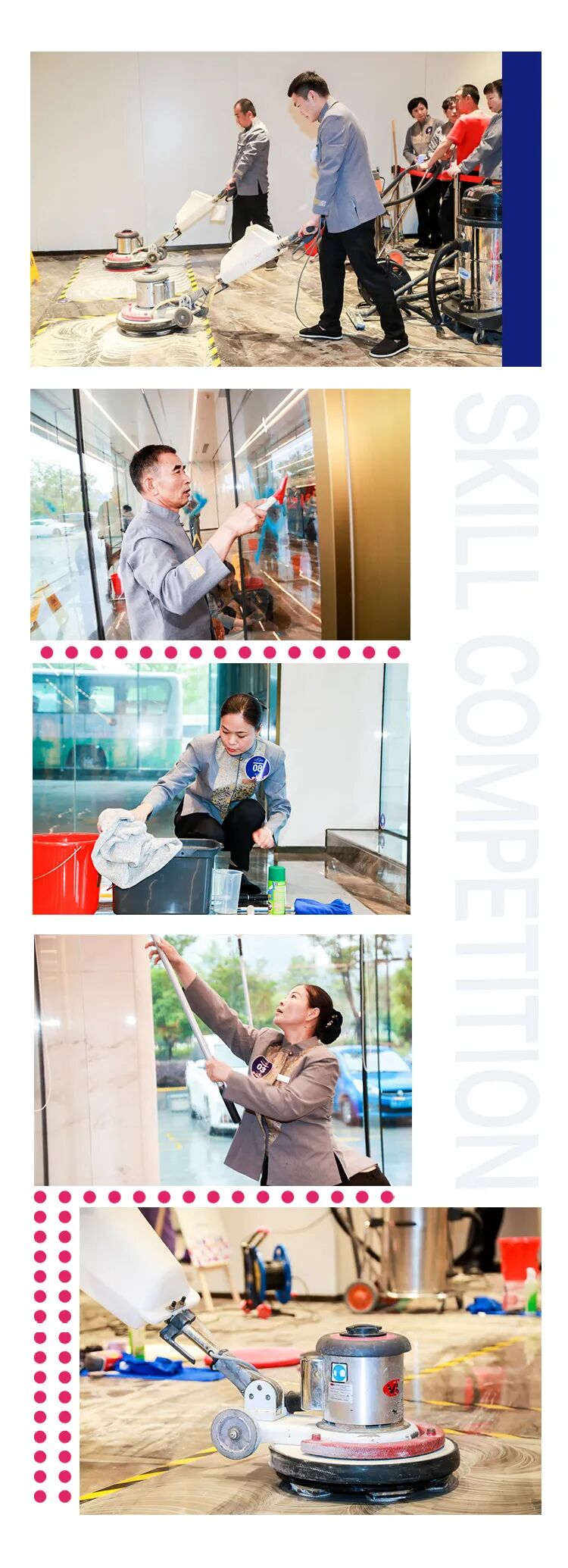 在短短一天的赛程,开元物业的选手们在安全技能、消防技能、SEGI运营系统实操、E-HR人资系统实操、SOA收费系统实操、物业管理员技能、管家技能、石材保养技能、玻璃清洗技能、不锈钢保养技能、电工技能、工程提升、病床消毒技能、运送技能实操、方案宣介技能、演讲技能、讲解员技能等17个项目上展开了激烈的较量,在比武中展现了物业人精湛的技能与不输专业运动员的风采。