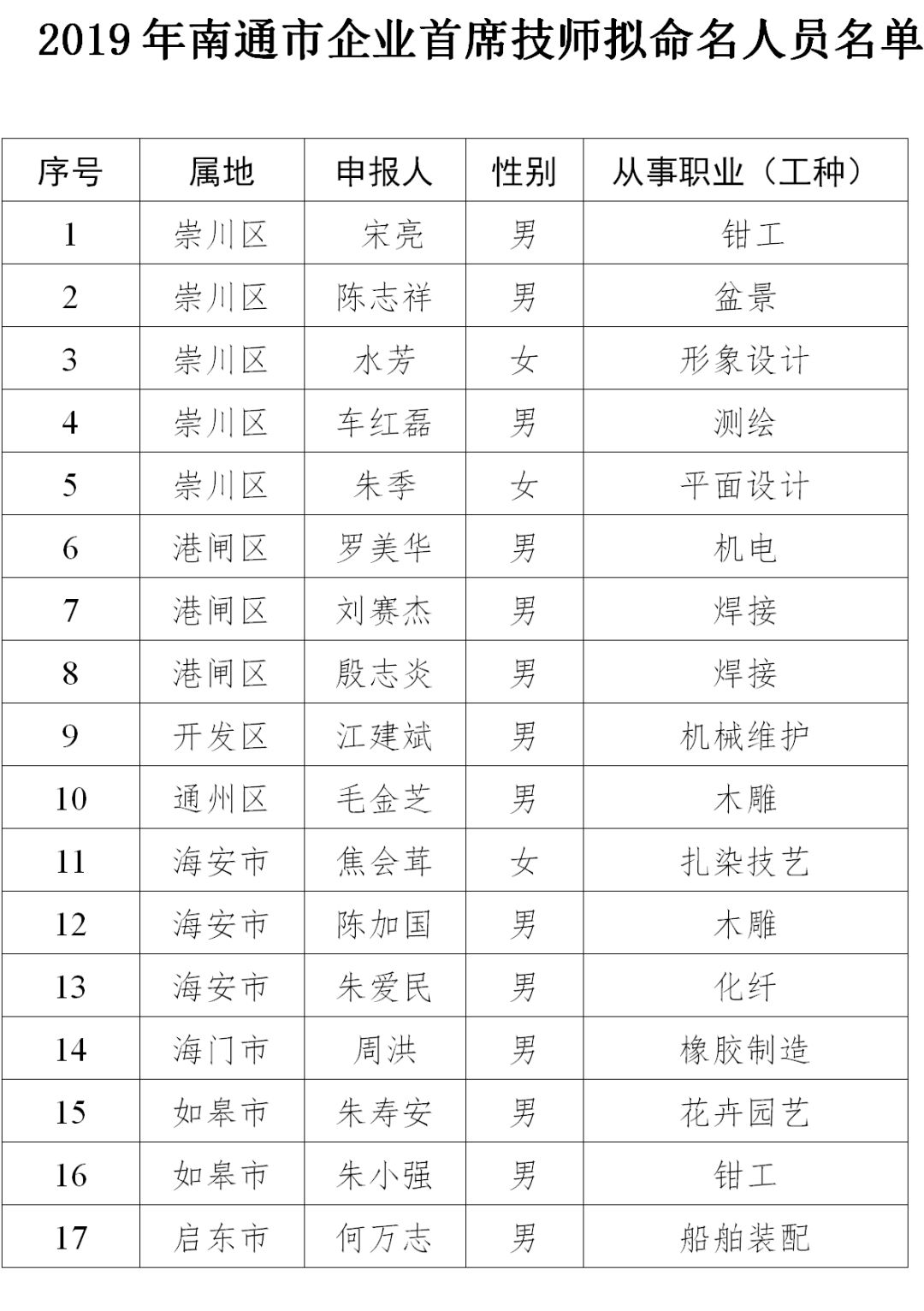 今天,南通市人社局网站发布《2019年南通市企业首席技师命名前公示》