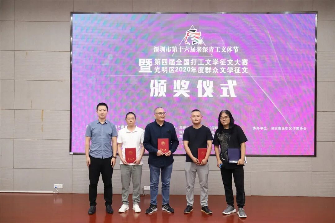 在全国打工文学征文大赛隆重举办的契机下,为进一步推动光明区文学发展,同时开展了由光明区文化广电旅游体育局主办,区公共文化艺术发展中心承办、区作家协会协办的光明区2020年度群众文学征文活动。从5月开始在光明区发动征稿,至6月30日截稿,共收到光明区作者来稿200多篇。最终,小说类、诗歌类、散文类、论文类作品总共评出金奖3名、银奖8名、铜奖12名、优秀奖12名,共计35个奖项。