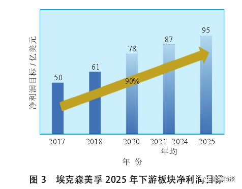 值得注意的是,埃克森美孚大幅上调了美国二叠纪盆地的产量目标,由2018年初提出的2025年60万桶油当量/日,提高至2024年产量超过100万桶油当量/ 日。支撑产量增长的因素主要有油气资源规模增加、基础设施开发计划,以及油气输送能力的增加。埃克森美孚称,即使在油价为35美元/桶时,二叠纪盆地的项目依然可以实现10%以上的投资回报。为提高二叠纪盆地页岩油气项目的效率,2019年2月,埃克森美孚携手微软在二叠纪盆地开展数字化技术应用,目的是优化开发方案,提高采收率和产量,同时降低成本。预计未来10年内,通过应用数字化技术,提高运营效率和降本,可增加数十亿美元现金流入,并助力二叠纪盆地到2025年产量增长5万桶/日。 为确保上游增长策略的顺利推进,2019年初埃克森美孚对上游组织机构进行了重组,将原来的勘探公司等6家专业公司重组为3家新的上游公司,即上游油气公司、上游业务开发公司和上游综合解决方案公司。其中,上游油气公司负责管理全球非常规油气、LNG、深水、重油和常规油气五大业务;上游业务开发公司将负责上游战略开发、风险勘探、收购和剥离,以及油气资产组合的优化管理;上游综合解决方案公司将提供技术和专业的商业支持,如钻井研究与技术、天然气和电力市场优化,以及全球资源部署等。此外,埃克森美孚还在公司层面成立了全球项目公司,将大型资本项目规划和执行的各类力量集中到一起,支持上游、下游和化工三大板块所有项目。 3   下游:聚焦于高端产品和区域性市场 下游业务是确保公司盈利的稳定器。虽然下游的增长目标低于上游和化工,但净利润持续稳步增长,始终是公司第二大盈利支柱。埃克森美孚计划,在油价60美元/桶的水平下,到2025年下游板块净利润达到95亿美元,比2017年增长90%(见图 3)。