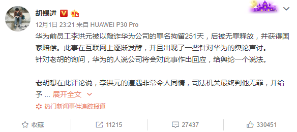 针对老胡的询问,华为的人说公司将会对此事作出回应,给舆论一个说法。老胡想在此评论说,李洪元的遭遇非常令人同情,司法机关最终判他无罪,并给予国家赔偿,这是事情对错一锤定音的结论。我还认为,公众同情弱者的情绪是健康的。华为是个强大的公司,它的一名前员工因为与公司发生了纠纷,受到了这样的不公正对待,这非常让人遗憾,很多人出于朴素的感情对华为产生一些负面情绪,也是正常的。同时老胡也想说,华为有十几万员工,堪称电信帝国,它的内部组织和管理结构注定是相当复杂的。李洪元的遭遇其实是与华为某个具体部门的冲突,当然,华为公司没能及时作出反应,帮助这一冲突以更合理的方式化解,这反映了华为的管理是存在缺陷的。我支持这件事情以更加公平、合理而且有温度的方式彻底解决。与此同时,我不主张将这件事情过度上纲上线,用它来对整个华为公司进行道义上的否定。我觉得那样做不够理性和实事求是。谁都会出差错,再伟大的公司也难免俗。客观说,华为的管理总体上是比较科学的,综合效果也是比较好的。据报道,华为每年要投入巨额资金用于优化公司的管理。华为不仅在5G网络技术走到世界前列,它还为中国培养锻炼了大批人才。对这样的公司,我们不应因为一个孤立事件就给它扣上沉重的大帽子,贴上不应有的标签。老胡希望华为的回应能够早点出来。我呼吁舆论给这件事的公平合理解决创造有利的氛围。