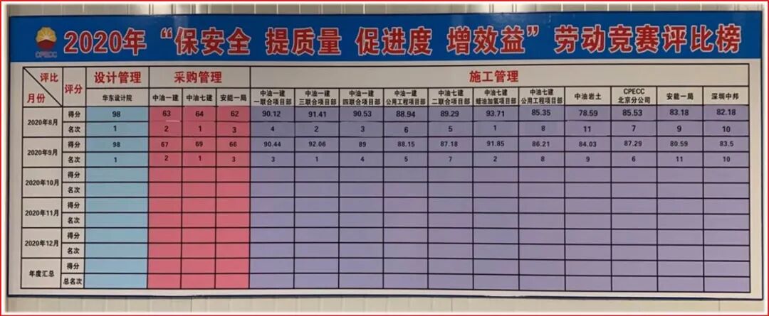 11月初,广东石化炼化一体化项目部劳动竞赛10月份赛况公布,一建公司三联合、七建公司二联合项目部,以及西南分公司EPC项目部获月度安全先进项目部荣誉称号,一建公司一联合项目经理刘锋勋、七建公司蜡油加氢项目经理王吉获月度金牌项目经理荣誉称号。劳动竞赛还特设“执行力最差项目部”奖项,如果哪个项目“连续三次中奖”,项目经理将被换掉。