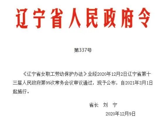 近日,为了加强对女职工的劳动保护,减少和解决女职工在劳动中因生理特点造成的特殊困难,保障其安全和健康,《辽宁省女职工劳动保护办法》正式对外发布,自2021年3月1日起施行。