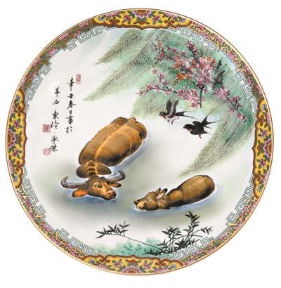 2月3日,立春,周承杰在朋友圈里发了一张广彩《春牛图》的图片,同时送上自己的祝福。《春牛图》中,一大一小两只牛在水里畅游,上空两只燕子在桃花下追逐嬉戏,一个祥和幸福、生机盎然的场景便出现在眼前。今年,中国工艺美术大师翟惠玲及其弟子周承杰带来的《春牛图》为这个春节增添了不少祥瑞的气氛。