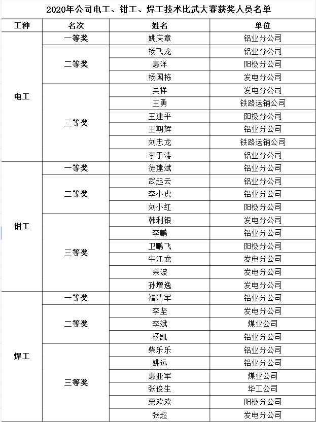 按照公司年度培训工作安排,10月15日,由公司人力资源部主办,三个分公司承办的公司2020年电工、钳工、焊工技术比武大赛分别在铝业分公司供电车间、阳极分公司电修车间、发电分公司机务检修楼隆重举行。