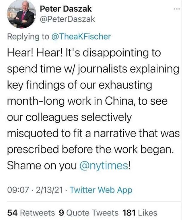 在得到菲舍尔的回应后,达扎克再次发文表示美媒的行为令人“失望”且“无耻”。他表示,“在和记者们解释了我们在中国长达一个月的调查得到的重要结果后,我们的同事所说的话却在工作还没开始前就被媒体断章取义地用来编自己的报道,这真的令人失望。《纽约时报》太无耻!”