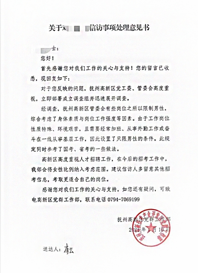 随后,有网友质疑,如此招聘涉嫌就业性别歧视。今年1月10日,江西抚州高新区党群工作部回应称,部分岗位之所以限制男性,综合考虑了身体素质与岗位工作强度等因素。由于工作岗位性质特殊、环境艰苦,且需要经常加班、从事外勤工作或奋斗在一线从事基层工作,因此设置了只限男性的条件。
