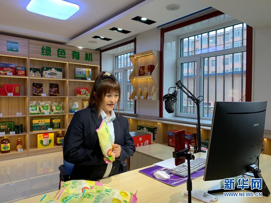 在黑龙江省海伦市的特殊群体网红培训基地,学员曲玲在直播销售豆粉产品(2020年11月17日摄)。新华社记者 孙晓宇 摄
