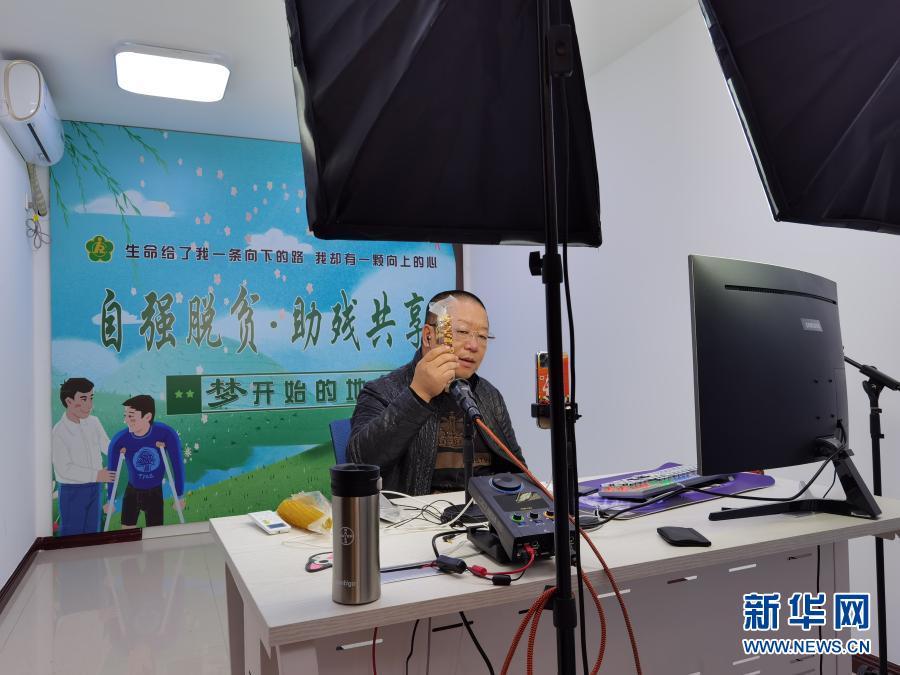 在黑龙江省海伦市的特殊群体网红培训基地,学员张诗富在直播销售玉米产品(2020年11月17日摄)。新华社记者 孙晓宇 摄