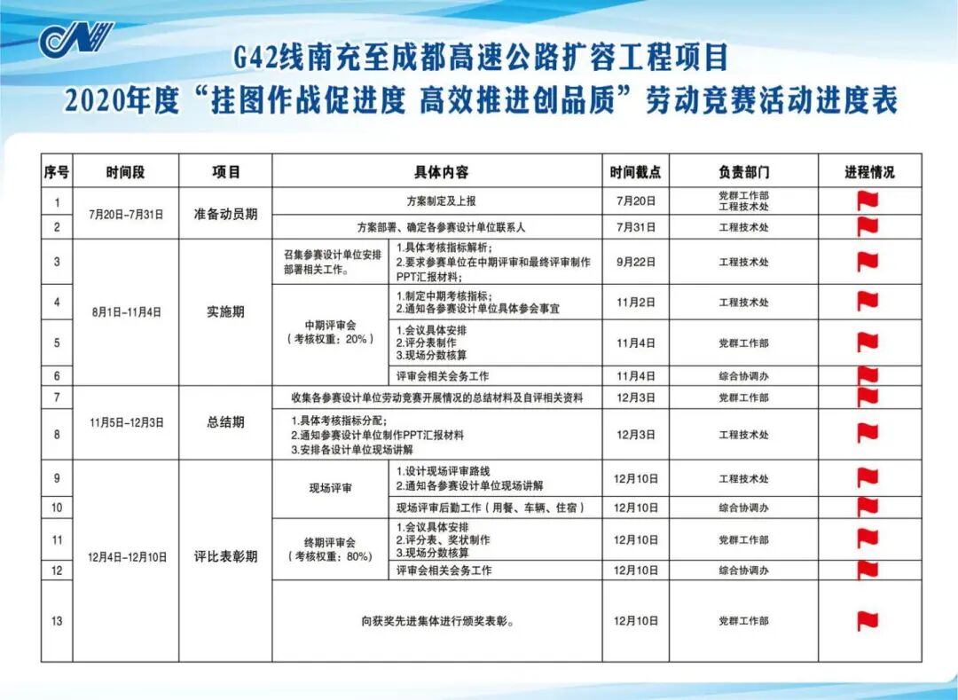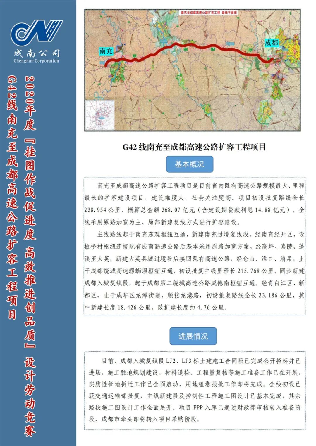 为认真落实交投集团及川高公司关于有力有序推进重点项目建设要求,按照四川省总工会、省交通运输工会关于深入开展“当好主人翁、建功新时代”主题劳动和技能竞赛的部署,成南公司于2020年7月至12月开展了G42线南充至成都高速公路扩容工程项目(以下简称项目)2020年度“挂图作战促进度 高效推进创品质”设计劳动竞赛。