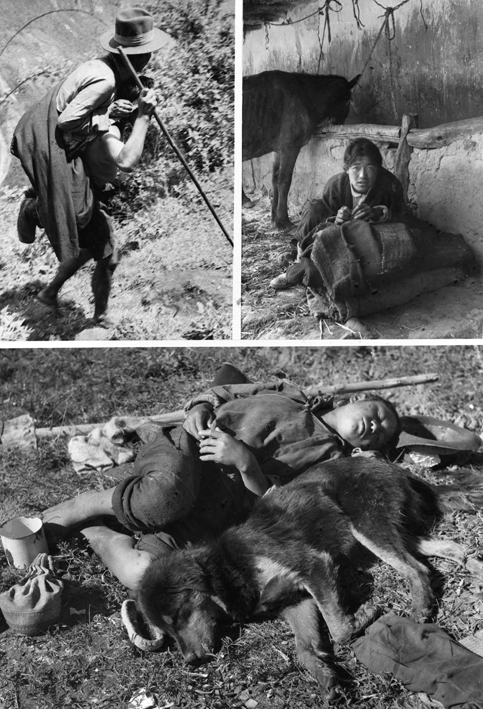 上图左:西藏农奴制度下的“人背人”(即农奴像牲畜一样背驮着农奴主)差役。上图右:和牲口同住的农奴。下图:农奴益西钦沛服劳役后与犬同眠。(新华社发)
