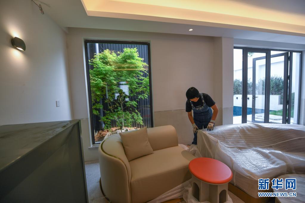4月17日,河桥镇一家民宿的主人张雁在整理新家具。新华社记者 徐昱 摄