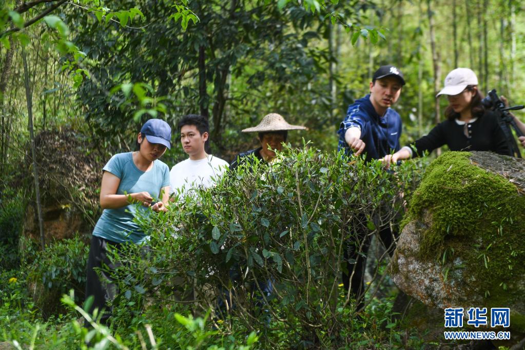 4月17日,河桥镇一家民宿的客人在山坡上体验采茶。新华社记者 徐昱 摄