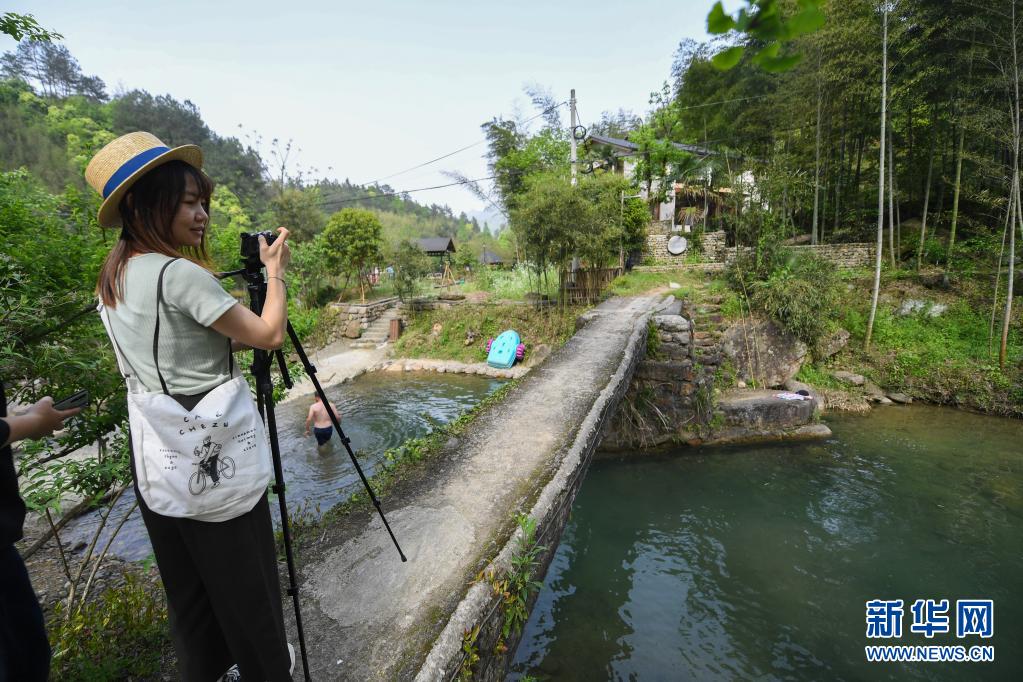 4月17日,河桥镇一家民宿的客人在拍照。新华社记者 徐昱 摄