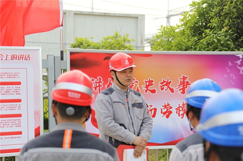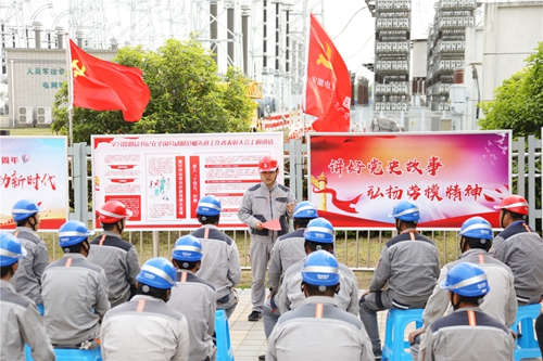 4月20日,在特高压皖南1000千伏变电站GOE套管隐患治理工作现场,20余名现场施工队员利用工作间隙围成一圈,聆听全国劳模、安徽送变电特高压项目经理王开库讲述党史故事和经验分享。