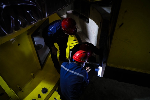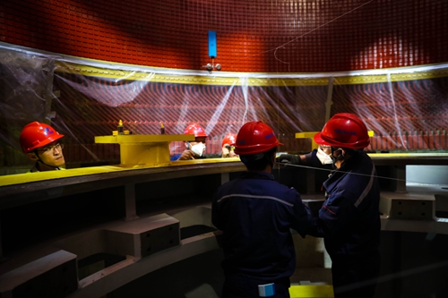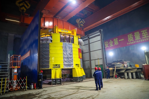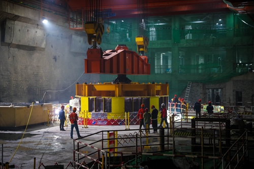 图为定子被送入机坑内(薛晓秋 摄) 4:50,伴随着现场工人的欢呼,“1号定子”入坑就位。刘事琼拍了拍郑达炜的肩,笑说:“今天可以早点收工了!明天继续!”