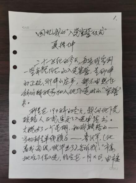 夏老手写版“回忆我的 ‘ 入党宣誓仪式’”。湖北省社会科学院 供图 坐下后,老秦首先说:“祝贺你,市委上周正式批准了你的入党申请信!”我还来不及感谢,他接着说:“抓紧时间,下面我代表市委‘主持’你的宣誓仪式:宣誓词我念一句,你跟着念一句!”于是,他就开始念誓词,我就跟着念。“我志愿加入中国共产党......”声音只有我们两人才听得见。前后不到半小时,庄严的入党宣誓仪式就结束了。老秦紧紧握住我的手,眼光中显示着兴奋的“欢迎新党员”的表情。就这样,1949年1月,我正式成了一名中国共产党员!