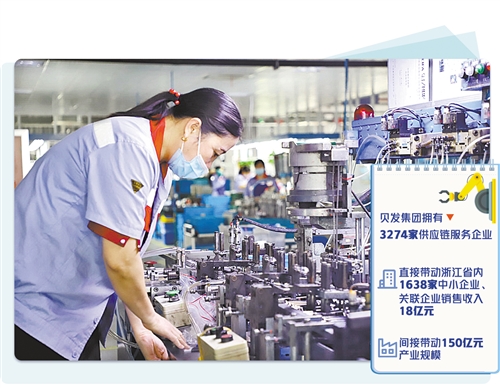| 位于浙江省宁波市的贝发集团以制笔起家,是目前国内文具行业的龙头企业。贝发集团整合产业链、供应链,形成“一支笔、一条链、一个平台”的创新发展战略。如今,贝发集团拥有3274家供应链服务企业,直接带动浙江省内1638家中小企业、关联企业销售收入18亿元,间接带动150亿元产业规模,新增产业链就业岗位1万个以上。 |