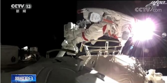 神舟十二号航天员 聂海胜:好的。我穿着我们航天中心所做的新一代的舱外服站在机械臂上,舱外服也非常地合体,也能长时间地支持我们舱外作业。机械臂在大范围地转移过程中非常稳,到位的精准度也比较高,我们在机械臂上固定支撑得也比较好,所以到了作业点我们能够解放双手,很快地就把舱外的安装工作做完。所以说是人、机械臂和舱外服完美的配合。
