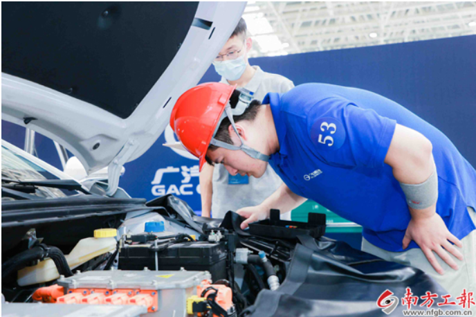 “考题瞄准了汽车‘新四化(电动化,网联化,智能化,共享化)’发展趋势,围绕广汽集团智能网联和新能源汽车技术前瞻布局,以培养高端制造技术骨干为目标,全面考查选手的综合能力。“大赛的裁判长、广州市交通技师学院汽车系汽车维修专业老师何贤亮表示,从传统燃油车到新能源汽车,汽车技术路线有了很大调整,这也意味着汽车技术服务相关岗位也将面临新的调整,而其中最大的人才缺口就在汽车售后服务、维修领域,“目前维修网点还是原来的专攻传统汽车维修的技工、技师,新能源汽车维修人才十分短缺”。