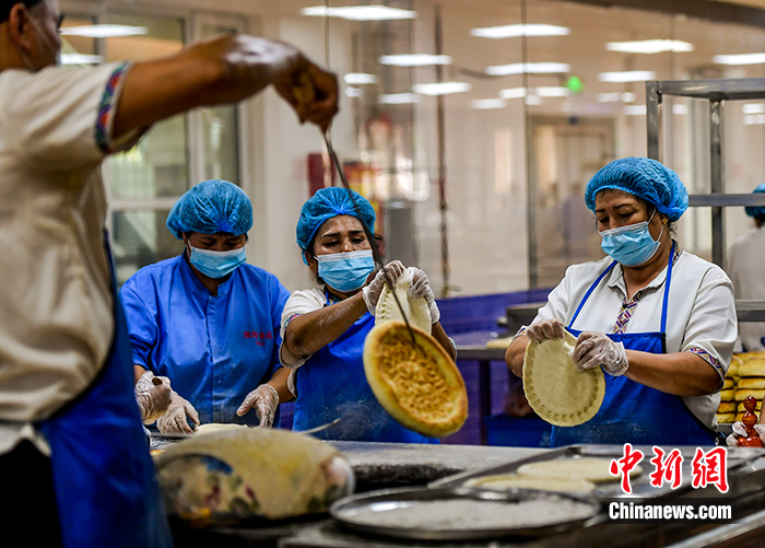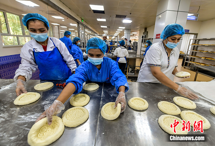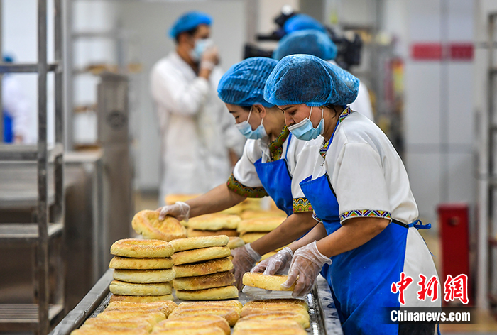 图为9月28日,塞外疆馕文化小镇生产加工车间里,员工正在加工、烤制各种馕产品。中新社记者 刘新 摄