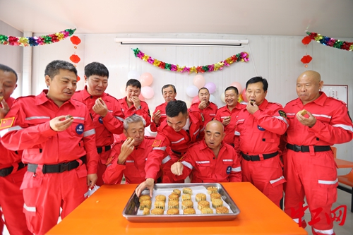 9月16日,北京建工应急抢险大队的队员刚刚参加完海淀区防汛执勤值守回到抢险基地,就收到了香气四溢的月饼。“这是枣泥的,我的最爱”、“我还是喜欢豆沙馅的”、“我要吃榴莲的”……队员们各自挑选着自己喜欢的口味,欢快的笑声响彻整个基地。(机施集团物业公司 韩伟伟/文  秦碧霞/图)