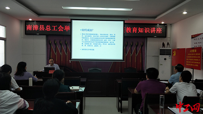 中工网讯 近日,湖北省襄阳市南漳县总工会举办“三减三健”健康教育知识讲座。活动邀请县中医院主任医师陈其华授课,全体干部职工参加。