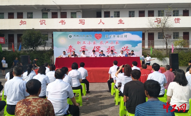 中工网讯9月27日,重庆丰都县人民医院职工小家与该县栗子乡南江村农户小家牵手促振兴活动启动仪式在南江村举行。丰都县委常委、副县长穆振武出席仪式并讲话,重庆市总工会二级巡视员邹继敏宣布活动启动,拉开机关、企业和其他经济社会组织职工小家牵手农户小家共促乡村振兴试点工作的帷幕。